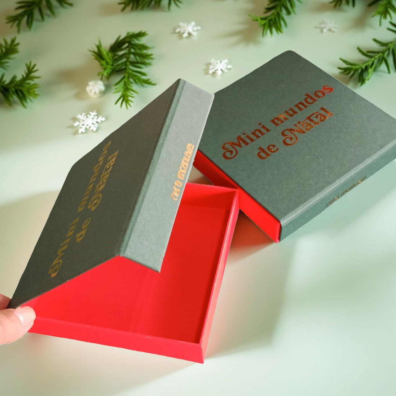 Caixa com fechamento em imã e frase na tampa externa em dourado nas medidas 13cm x13cm x2,5cm nas cores verde e vermelho (natal)