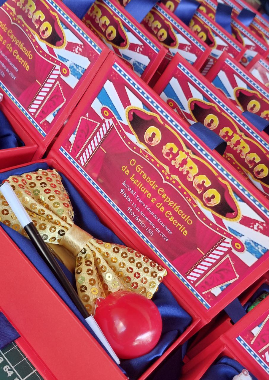 Caixa para convite Luxo no Tema Circo, cartonada (rígida) , com "almofada" em tecido de cetim, laço de cetim e tag com nome dos convidados em foramto de ticket de entrada.
