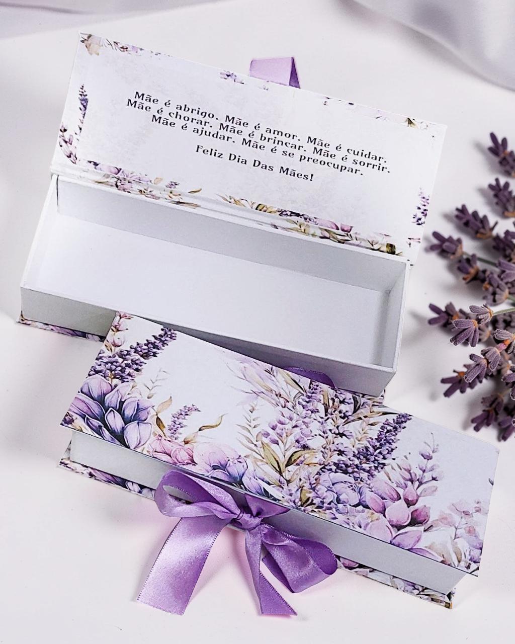 Caixa lavanda com fechamento em laço de cetim medindo 22 x 8 x 3 cm, com arte personalizada por dentro, podenso usar como convite, lembrança ou presente.