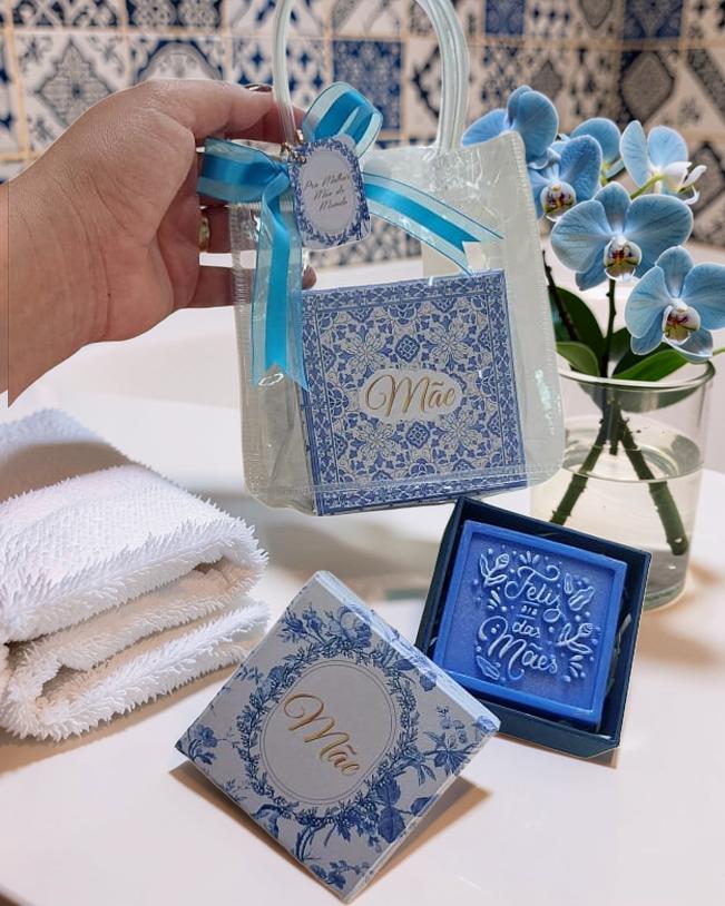Kit de Sabonete quadrado com a mensagem "Feliz dia das Mães" e florais, na caixinha cartonada 8x8x4, na cor azul marinho com estampa na tampa estilo azulejos portugueses ou florais azuis, com aroma de orquidea azul.