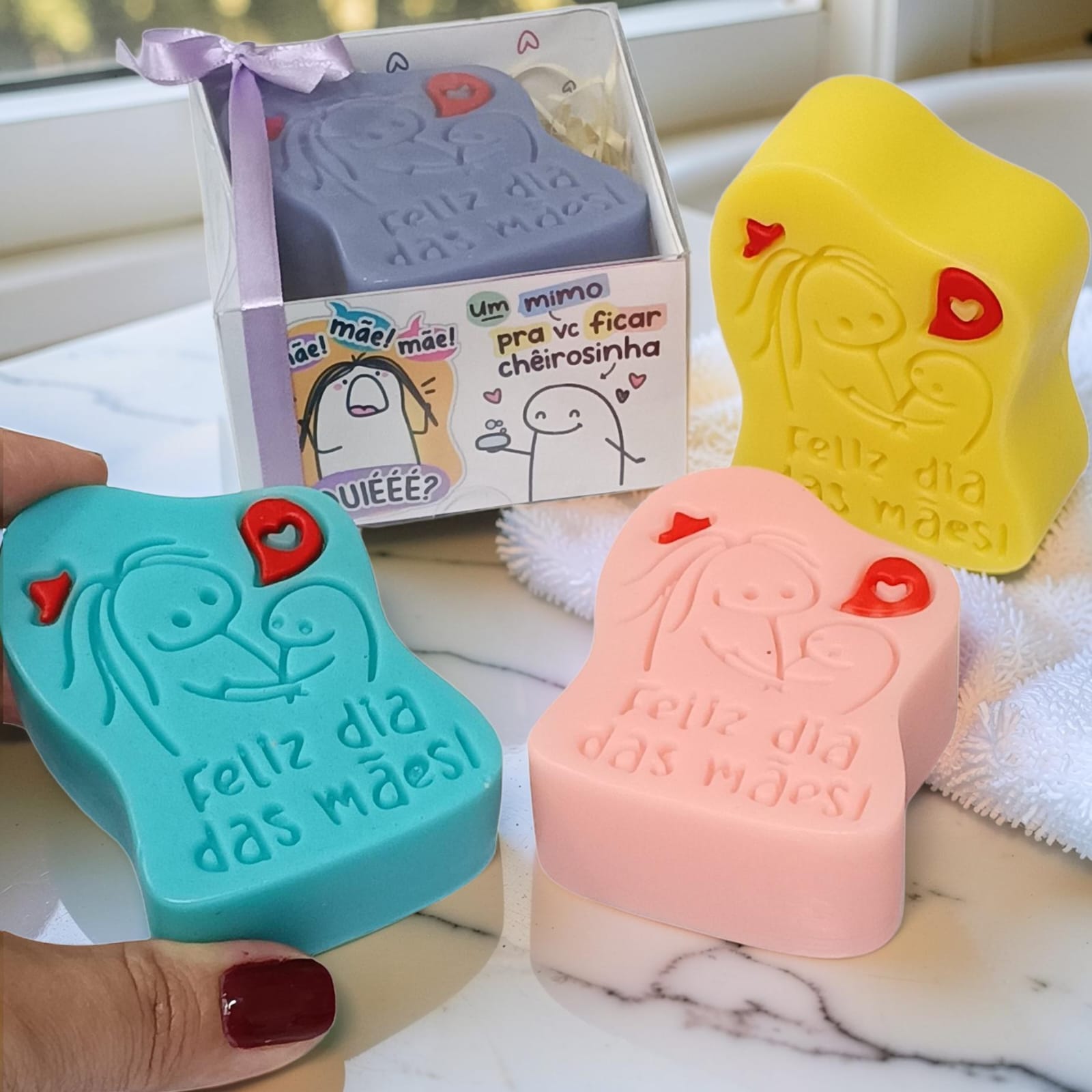 Sabonete Tema Flork divertido para dia das mães com aproximadamente 120g, na caixinha de acetato, rótulo no tema e laço de cetim na cor do sabonete.