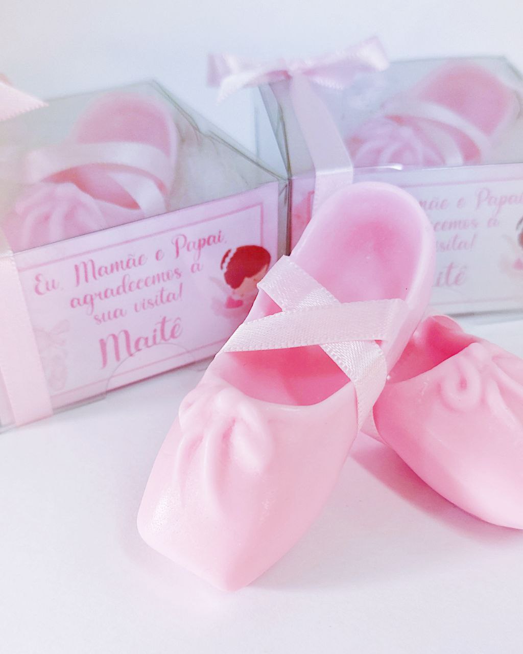 Sabonete no formato de sapatilha bailarina na caixinha de acetato com laço de cetim e cetim imitando a fita da sapatilha.